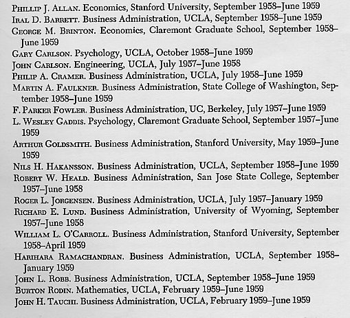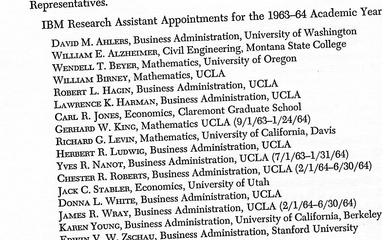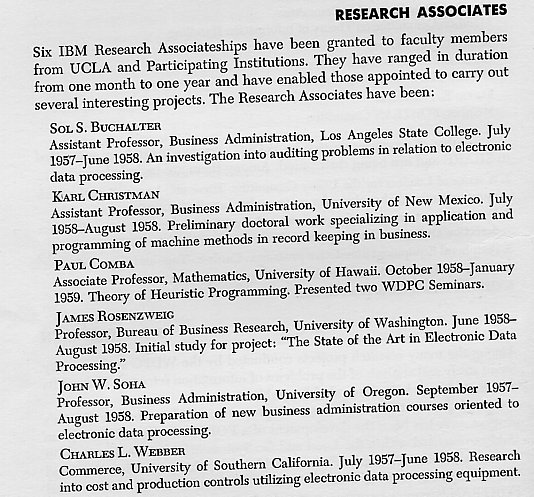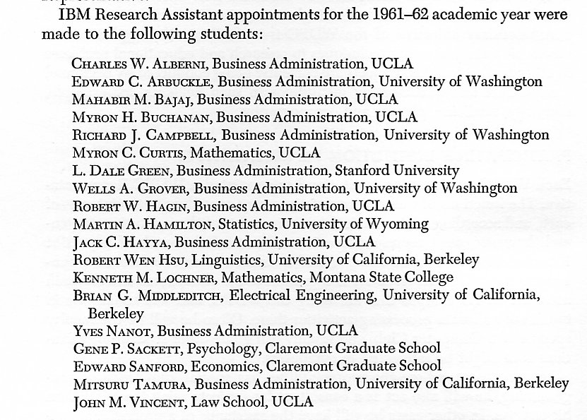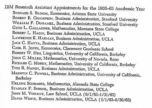 Each academic year, research assistant appointments were awarded to graduate students with special funds provided by the IBM Corporation. All applications for these positions were reviewed by the WDPC Advisory Commitee and appointments made based on their recommendations. In general, the RAs at UCLA were half-time appointments who helped the Center fulfill its mission by undertaking projects or performing duties outlined by the Director. At Participating Institutions, their duties were prescribed by the WDPC Representative. In each case, their work was a vital contribution to the successful functioning of the Center as well as a unique educational experience for them. Appointments for all years except 1959/1960 are known. For some reason, that academic year was not reported in a WDPC Progress Report.